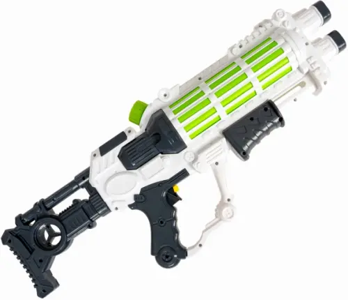 Стильный бело-черный Автомат двухстволка с салатовыми вставками гарантирует восторг у ребенка.