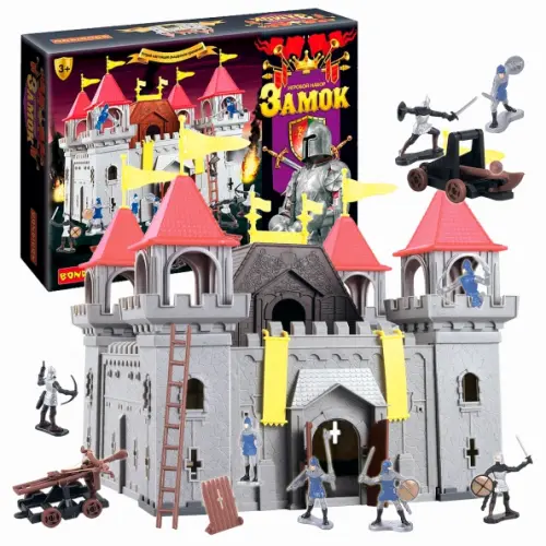 В комплект входят: детали для сборки замка, фигурки рыцарей, лошадей и прочие аксессуары.