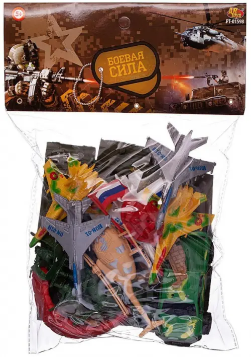 Комплектность: военный самолет - 5 шт., вертолет, танк - 2 шт., военная машина, укрытие - 2 шт., солдатики - 10 шт., флаг.