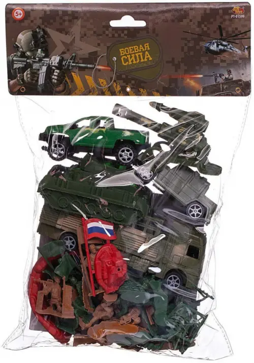 Комплектность: военная машина - 3 шт., танк, укрытие - 2 шт., флаг, пушка, солдатики - 30 шт (15 желтых и 15 зеленых).