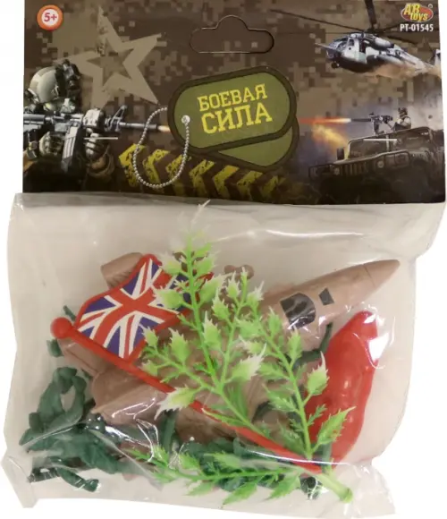 В состав военного набора "Боевая сила" входят: 6 солдатиков, флаг, дерево и самолет.