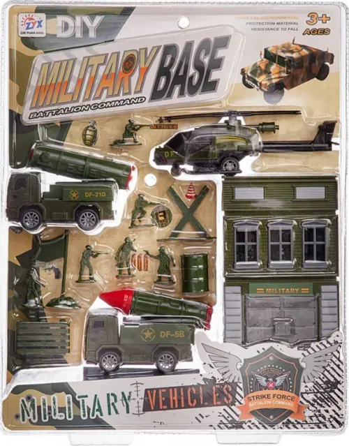 Игровой набор "Военная база" подарит мальчику возможность задействовать своё воображение и придумать множество сюжетов для интересной игры! Ребёнку будет интересно с ним играть как самостоятельно, так и в компании сверстников. Набор выполнен в традиционной зелено-камуфляжной гамме. В его составе двухэтажное здание штаба, 2 машинки и вертолет, 4 фигурки, специальные знаки и предметы.