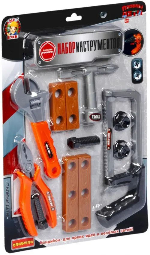 В комплекте игрового набора ПАПИНЫ ДЕТИ 12 предметов: ножовка по металлу, пассатижи, отвертка, разводной ключ, 2 болта с гайками, аксессуары для игры.