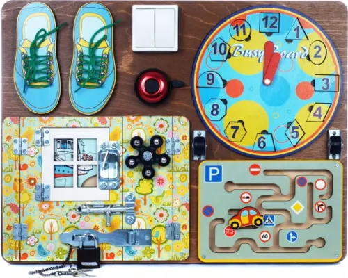 На доске имеются шнуровки, магнитные часы со стрелками и цифрами-вкладышами, различные виды включателей и замков, а также головоломка-лабиринт с фигуркой-машинкой и рисунками дорожных знаков.