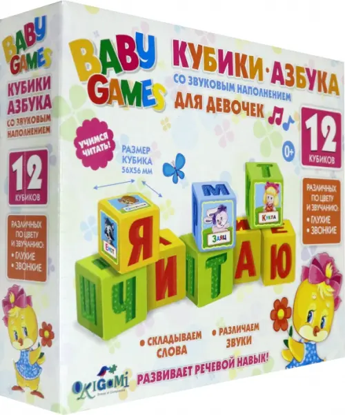 В наборе 12 кубиков различных по цвету и звучанию (глухие и звонкие согласные, гласные).