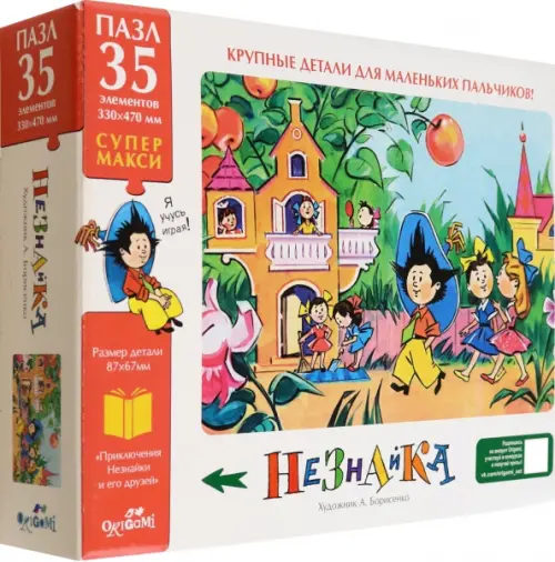 Большой пазл 35 элементов с иллюстрациями Борисенко из всеми любимой сказки о приключениях Незнайки понравится любому ребёнку, а сборка яркой картинки принесет радость не только малышам, но и их родителям. Крупные детали пазла удобно ложатся даже в самую маленькую ручку! Соберите всю коллекцию новых пазлов!