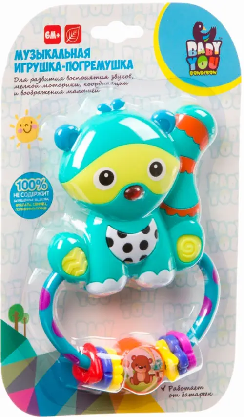 Игрушка-погремушка музыкальная ТМ BABY YOU BONDIBON "ЕНОТ" предназначена для малышей от 6 месяцев. При нажатии на воротничок звучат мелодии и мигает нос. На обратной стороне игрушки находится безопасное зеркальце. Прикрепленные колечки предназначены для развития мелкой моторики крохи. Игра с забавным енотом не только развлечет Вашего малыша, но и поспособствует формированию тактильных ощущений, восприятия звуков, цветов и форм, поможет в развитии мелкой моторики и воображения.