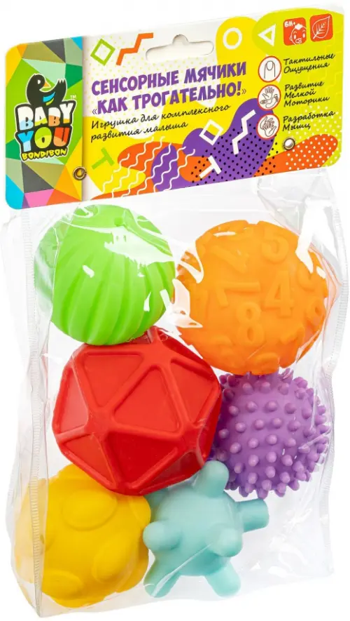 Эффективное средство для развития тактильных ощущений, улучшения мелкой моторики, а также разработки мышц! Незаменимый подарок для комплексного развития малыша. Рельефные поверхности мячиков способствуют развитию мелкой моторики и тактильных ощущений малыша. Яркие цвета стимулируют развитие зрения крохи. Выполнены из мягкого приятного на ощупь материала. Удобно держать и катать маленькими ручками.