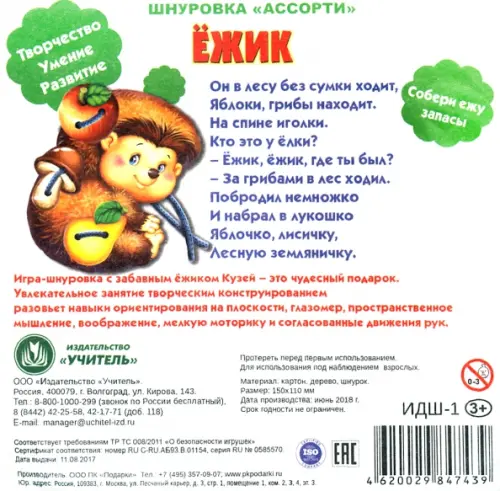 Игра-шнуровка с забавным ёжиком Кузей - это чудесный подарок. Увлекательное занятие творческим конструированием разовьет навыки ориентирования на плоскости, глазомер, пространственное мышление, воображение, мелкую моторику и согласованные движения рук.
