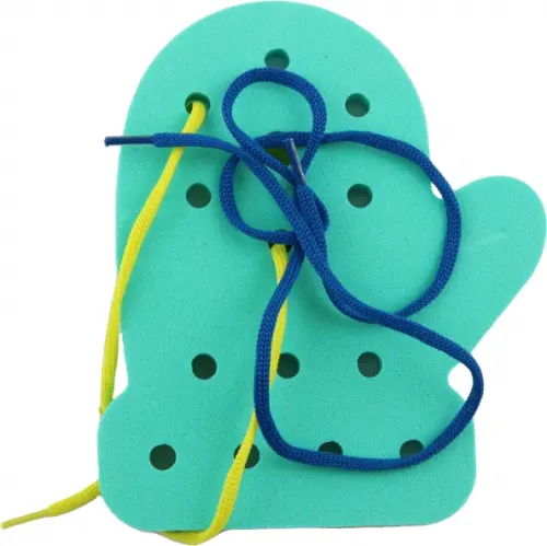 Элементы игры имеют крупные отверстия для того, чтобы ребенку было удобно шнуровать.