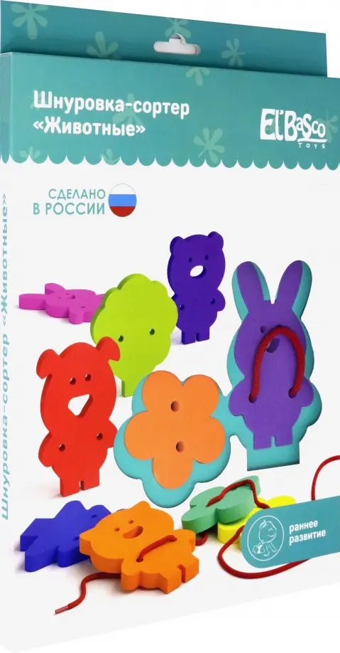 В наборе «Животные» собраны образы животных, растений и деревьев разных цветов. Детали игрушки имеют по два крупных отверстия по центру каждой фигурки для нанизывания на шнуровку. Фигурки легко извлекаются из формы сортера и легко устанавливаются на свои места.