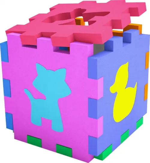 Мягкий кубик-сортер состоит из 6 граней с фигурными отверстиями, в которые малышу предлагается поместить подходящие по форме элементы. Кроме того, кубик можно собирать и разбирать целиком - детали легко соединяются между собой без дополнительных креплений и отлично держат форму. Толщина материала 8 мм.