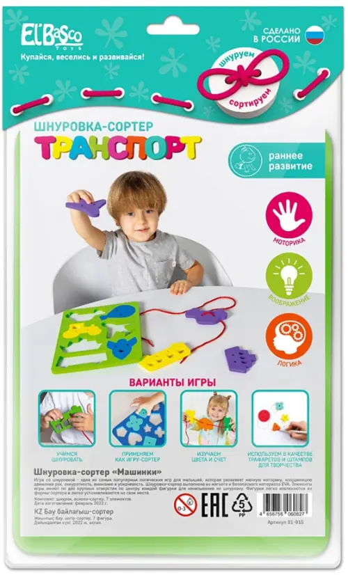 В наборе Шнуровка-сортер «Машинки» собраны различные виды транспорта разных цветов и размеров. Детали имеют по два крупных отверстия по центру каждой фигурки. Фигурки легко извлекаются из формы сортера и легко устанавливаются на свои места.
