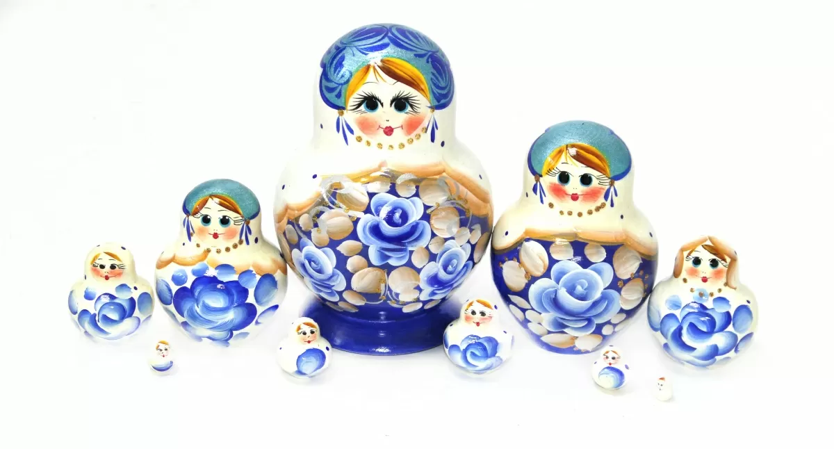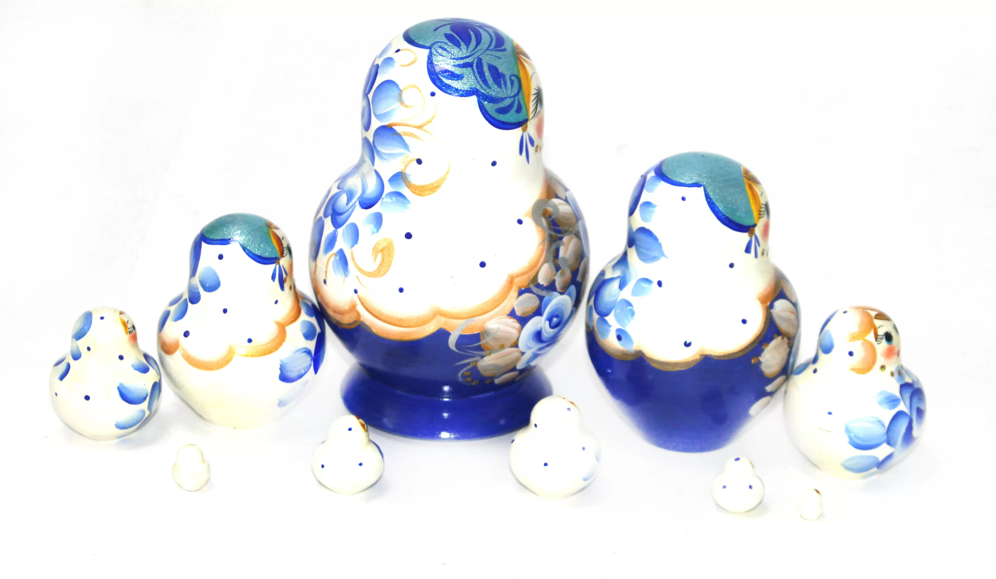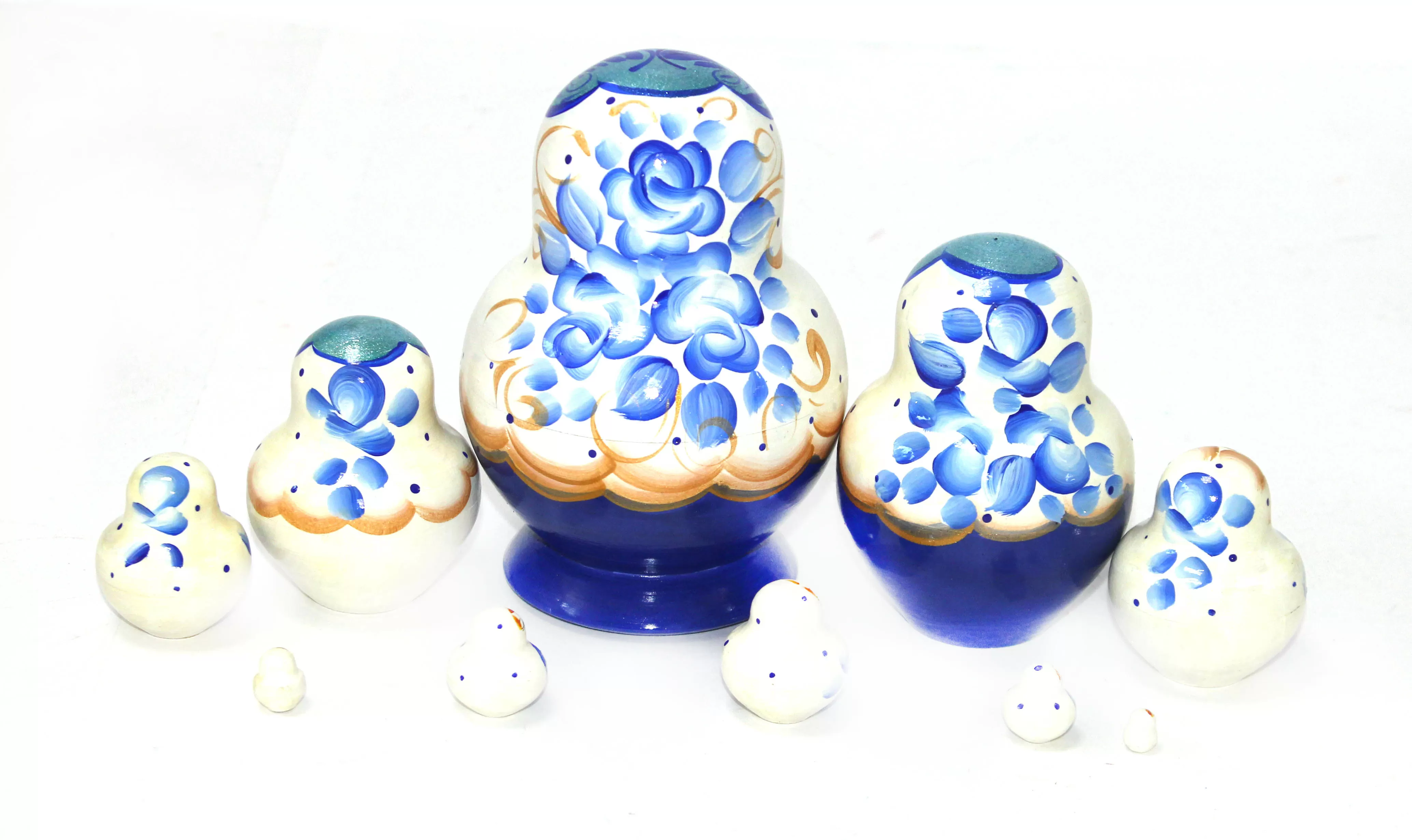 Белая небольшая матрешка с голубыми розами вмещает в себя девять кукол. В нашем каталоге русских сувениров есть даже мини-матрешки в половину роста этой. Ищите их в первом разделе с трехместными матрешками. Купить образец народных промыслов можно на сайте нашей фабрики сувениров. Есть доставка по всему миру.