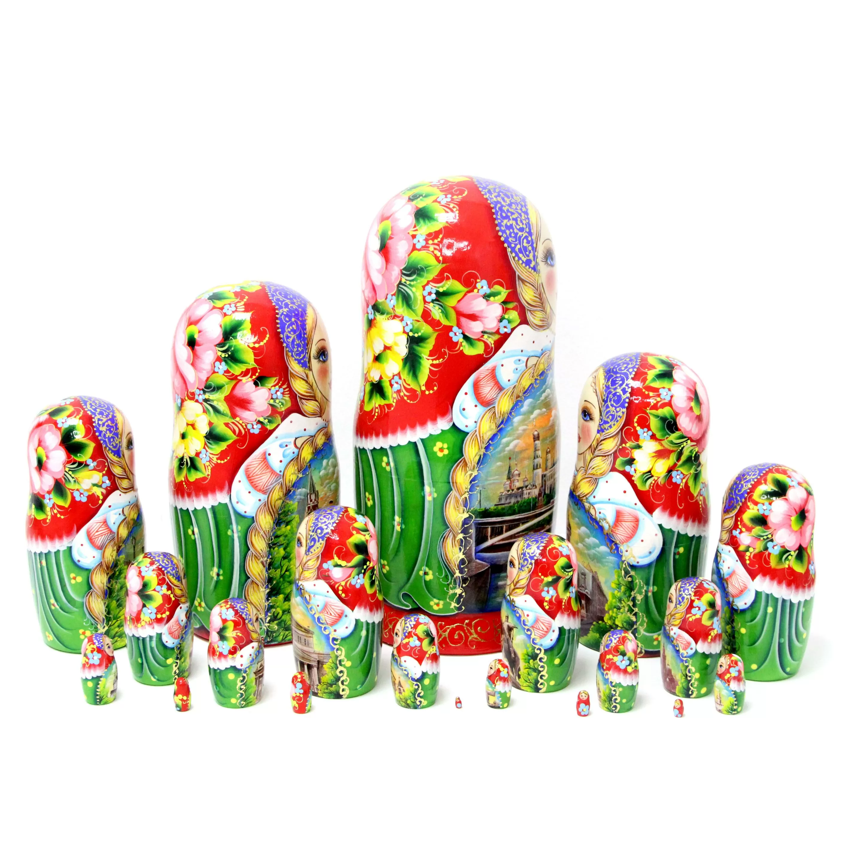 Уникальная 20-местная матрешка. Художники шатурской фабрики расписали ее видами Москвы. С этой матрешкой можно заново совершать путешествие в российскую столицу. Дорогой русский сувенир можно заказать на сайте фабрики по цене производителя. Выполняем частные и коммерческие заказы и отправляем их во все страны мира.