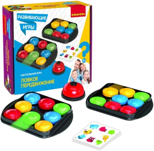 В комплекте: 40 карточек, 2 игровых поля, 16 разноцветных фишек, звонок.