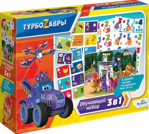 Обучающий набор 3 в 1 создан для эффективных занятий с ребенком. Внутри красивой подарочной коробки, выполненной в дизайне Турбозавров, вы найдете азбуку из 64 пазловых элементов. Считалочку из 16 примеров и пазл из 35 элементов размером 330х460 мм.