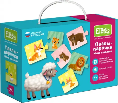 В процессе игры ребенок познакомится с разными видами животных, понятиями «большой-маленький», разработает мелкую моторику рук, разовьет логическое мышление. Благодаря очень прочному и толстому картону, из которого изготовлены элементы игры, малыш сможет собирать пазлы сколько угодно. Детали не потреплются и не порвутся от интенсивного использования.
