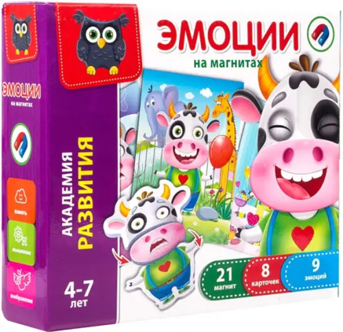 В набор входят яркие карточки с различными сюжетами и мягкие магниты, на которых изображена мимика Бобби. Малышу необходимо подобрать к карточке соответствующую эмоциональную реакцию.