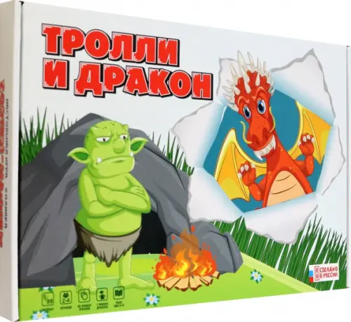 Большое поле с нарисованными троллями на котором стоит деревянная фигурка дракона. Кидаешь деревянный кубик с цветными гранями. Какой цвет выпадет, тех троллей нужно закрыть фишками, если выпадает коричневый, то дракон наступает и кушает троллей