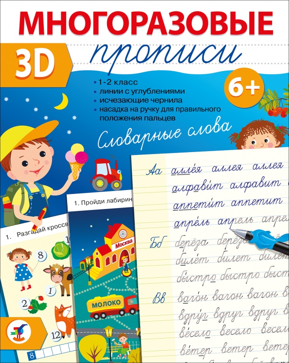 3D-прописи - современный занимательный тренажёр! На картонных страницах есть специальные углубления, благодаря которым ручка "сама" двигается в нужном направлении, а рука ребёнка "запоминает" правильное написание слов.
