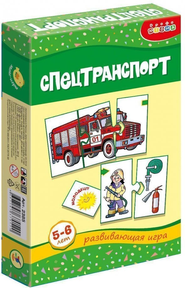 С помощью мини-игры "Спецтранспорт" ребенок познакомится с профессиями врача, милиционера, пожарного, спасателя, тележурналиста. В процессе игры у детей совершенствуется быстрота реакции, формируется чувство ответственности и долга. В инструкции дано описание трех игр, в которые можно сыграть с этими карточками. В играх "Профессии" и "Отправляемся в спецрейс" надо собрать все карточки, относящиеся к определенной профессии, а в игре "Передай другому" надо собрать спецмашину, состоящую из трех карточек.