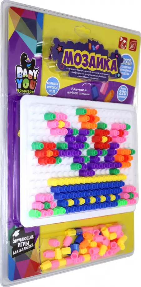 Яркая разноцветная мозаика легко собирается и подойдет малышам от 3-х лет. Вставляя разноцветные детали в пазы на игровом поле, ребенок соберет красочную объемную картинку.
