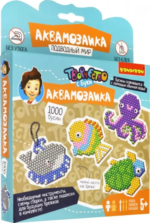 В наборе: набор бусин, пластиковая основа-планшет, распылитель воды, карточки-трафареты, пинцет, подвески для создания брелоков, самоклеящиеся глазки.