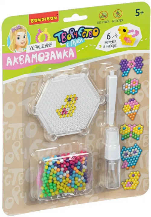 Состав набора: 350 цветных бусин, пластиковая основа для сборки, распылитель воды, карточки-трафареты, пинцет, 6 основ для колец.