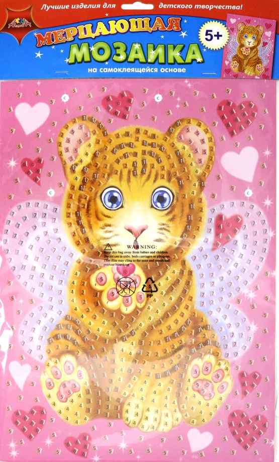 Набор для детского творчества понравится детям с 5 лет. На цветной картонной основе числами и цветом показаны места куда необходимо приклеить элементы мозаики. Элементы имеют клеевой слой, поэтому вы обойдетесь без клея и ножниц. В результате получится яркая картинка, которую отлично дополнят глазки и стразы.