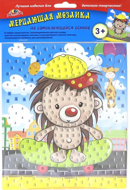 Набор для детского творчества понравится детям от 3 лет. На цветной картонной основе числами и цветом показаны места куда необходимо приклеить элементы мозаики. Элементы имеют клеевой слой, поэтому вы обойдетесь без клея и ножниц. В результате получится яркая картинка, которую отлично дополнят глазки и стразы.