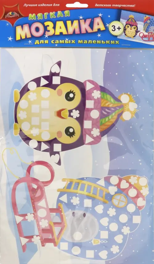 На цветной картонной основе контуром показаны места, куда необходимо приклеить элементы мозаики. Элементы из мягкого пластика разного цвета и формы имеют клеевой слой, поэтому вы обойдетесь без клея и ножниц. В результате получится яркая картинка.