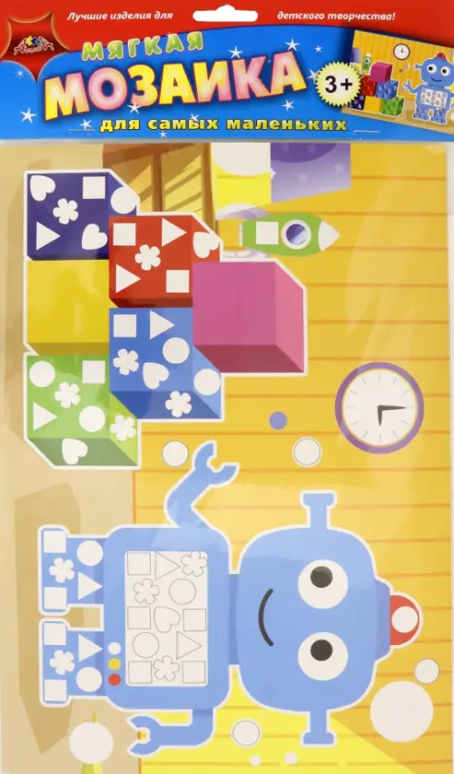 На цветной картонной основе контуром показаны места, куда необходимо приклеить элементы мозаики. Элементы из мягкого пластика разного цвета и формы имеют клеевой слой, поэтому вы обойдетесь без клея и ножниц. В результате получится яркая картинка.