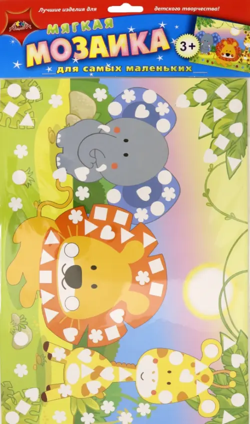 На цветной картонной основе контуром показаны места, куда необходимо приклеить элементы мозаики. Элементы из мягкого пластика разного цвета и формы имеют клеевой слой, поэтому вы обойдетесь без клея и ножниц. В результате получится яркая картинка.