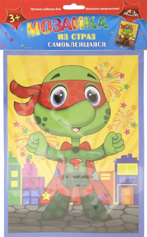 Набор включает цветную картонную основу размером 19,5х26,5 см, цветные элементы мозаики из геля, размер элементов 8 мм, поэтому приклеивать их могут дети от 3-х лет.