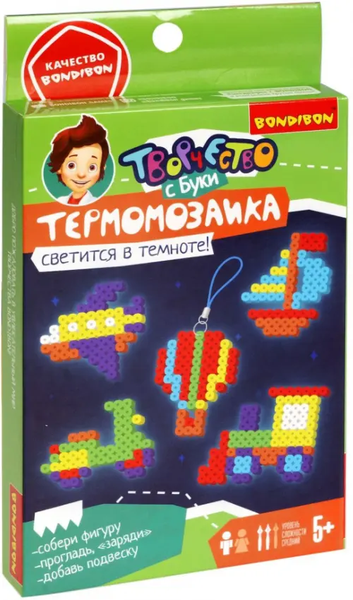 В комплекте: набор неоновых термобусин, планшет, калька, пинцет, подвески для брелоков, 5 цветных схем - паровоз, кораблик, самолет, самокат, воздушный шар.