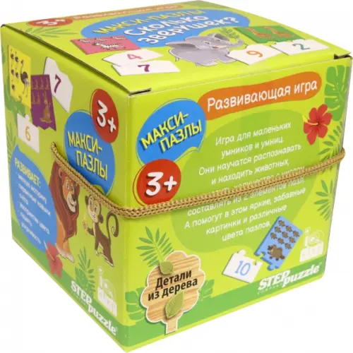 Развивающие макси-пазлы "Сколько зверушек?" рекомендуются для детей от 3 лет. Они станут отличными помощниками для родителей в процессе обучения своего чада. Составляя пазл из двух элементов, ребенок не только учится распознавать животных, но и соотносить количество с числом. Все детали цветные и выполнены из дерева.