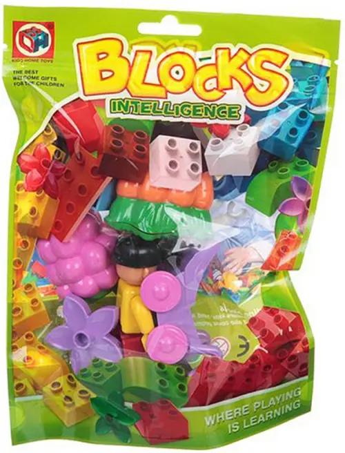 В наборе 8 деталей: 2 разных блока, 2 фигурки в виде морковки и винограда, тележка, цветочек, 2 фигурки человечков.