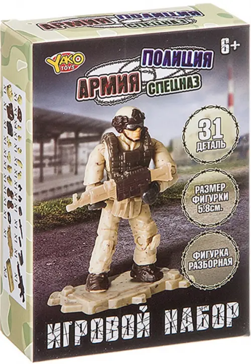 Конструктор. Серия Армия Полиция Спецназ. Разборная фигурка солдата (высота 5,8 см. руки и ноги на шарнирах). Хорошая детализация. Состав набора отображён в дизайне, инструкция прилагается. Рекомендуемый возраст - 6+