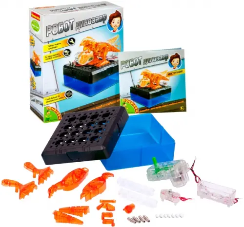 Состав набора: отсек для батареек, переключатель, пружинный соединитель, основание с отверстиями, экологичный многоразовый бокс, электромотор, крышка электродвигателя, привод, лапа, тело (правая и левая части), челюсть, нога, хвост (правая и левая части), соединительный шарнир, соединительный мост (для объединения нескольких опытов), руководство пользователя. Дополнительно потребуется 1 батарейка АА (не входит в комплект).