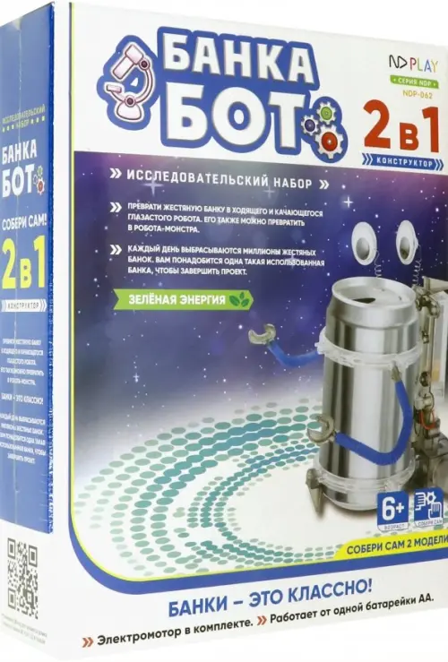 Банкабот - это забавный робот с мотором, дикий, но симпатичный. В основе его конструкции жестяная банка. Да-да, самая обычная жестяная банка, которую вы собирались выбросить. Найдите ей достойное применение и сделайте нашу планету чище! Банкабот может передвигаться как в вертикальном, так и в горизонтальном положении. Поменяйте местами провода, и милый глазастый робот превратиться в ползающего монстра с щупальцами. Банкабота можно раскрасить, дополнить подсветкой и звуковыми эффектами.