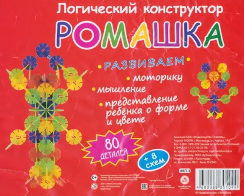 Детский конструктор "Ромашка" обязательно увлечёт ребёнка. В набор входит 80 разноцветных деталей: красного, жёлтого, синего и зелёного цветов. На упаковке представлено несколько схем сборки, которые можно использовать в качестве образца.