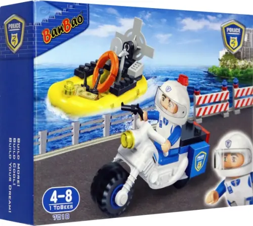Набор включает в себя скутер и лодку, а также фигурку полицейского.