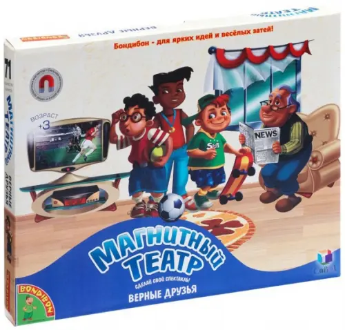 Игровой набор "Верные друзья" включает в себя 71 яркий магнит и большую магнитную доску. Магнитики разные - в виде детей и взрослых, предметов интерьера и многочисленных аксессуаров, которые помогут создать особую атмосферу в детской постановке. Магнитики крепко держатся даже при размещении в несколько слоев. В качестве сцены для постановки может подойти другая магнитная поверхность или даже холодильник!