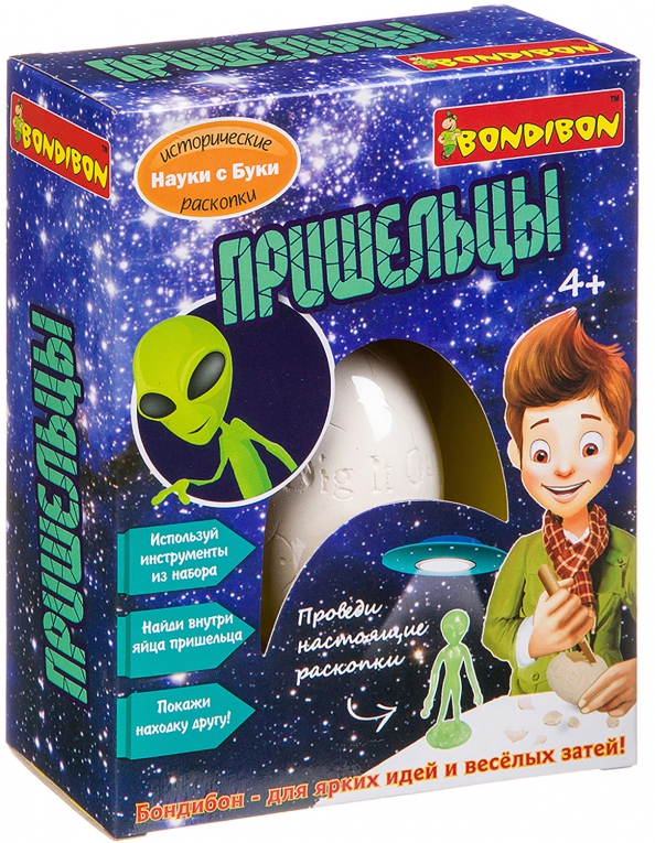 В научном мире уже давно бытует гипотеза о том, что когда-то нашу Землю посещали...пришельцы из космоса! С этим набором от Bondibon Ваш ребенок почувствует себя ученым-археологом, делающем уникальное открытие! А наградой ему будет фигурка гуманоида, светящаяся в темноте. В наборе гипсовое яйцо инструменты для раскопок. Игра с этим набором поможет развить внимание к деталям, мелкую моторику, когнитивные навыки.