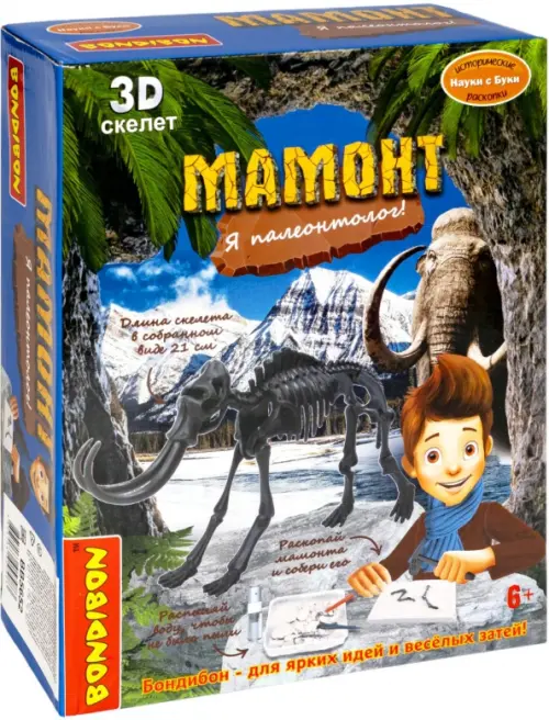 В комплекте: блок для проведения раскопок, молоток, зубило, пузырек с пульверизатором, скелет мамонта внутри гипсового блока, иллюстрированная инструкция.