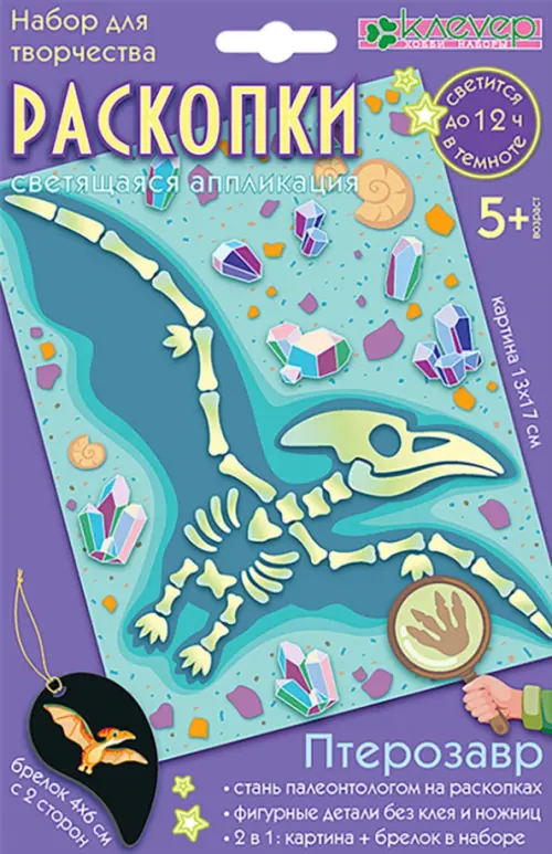 Набор «Раскопки. Птерозавр» - находка для любознательных детей! Ребёнок старше 5 лет не только погрузится в творческий процесс создания картины и брелока, но и представит себя в роли палеонтолога, открывающего миру скелет ископаемого животного, собирая его по косточкам.