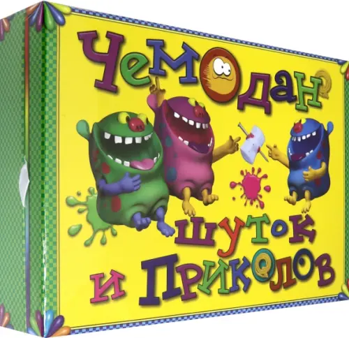 В наборе: 3 книги с цветными иллюстрациями, мешок смеха, брызгающий водой фотоаппарат, почти настоящие мухи, яйцо с сюрпризом, наклейка "разбитое стекло", игральные кубики с секретом, волшебная веревка которая становится твердой, прикольная жидкость, водяные бомбы, бумажная накладка "пачки долларов", "жвачка" с приколом, ручка с исчезающими чернилами.