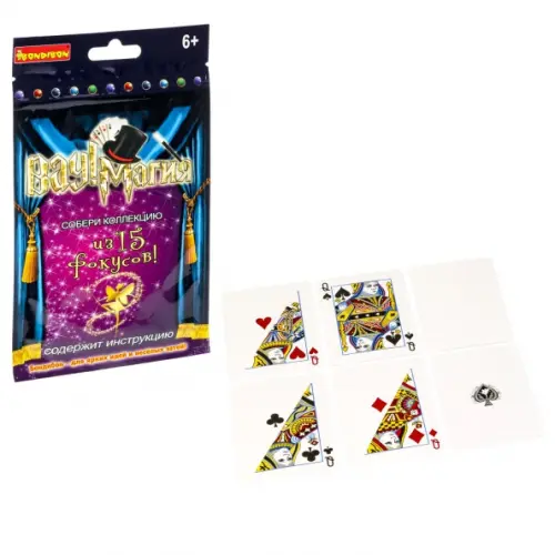 В комплект входят 6 специальных карт и наглядное руководство по проведению фокуса. Игровой набор дополняет коллекцию из 15 фокусов. Возраст 6+.