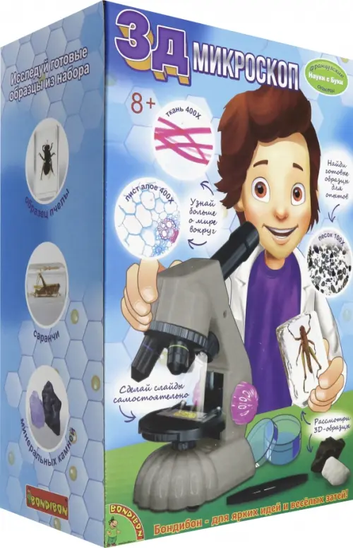 В набор входит все необходимое: микроскоп и аксессуары к нему, готовые образцы насекомых в эпоксидной смоле, готовые образцы полезных ископаемых кварц и мрамор, пустые слайды для самостоятельного приготовления образцов (3 штуки), покровное стекло (3 штуки), нож для нарезания образцов, чаша Петри (2 штуки), пинцет, инструкция.